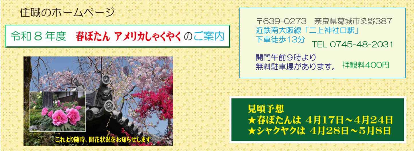 〒639-0273 奈良県葛城市染野387 近鉄南大阪線「二上神社口駅」下車徒歩13分 開門午前8時より 無料駐車場があります。 拝観料 400円 TEL 0745-48-2031
