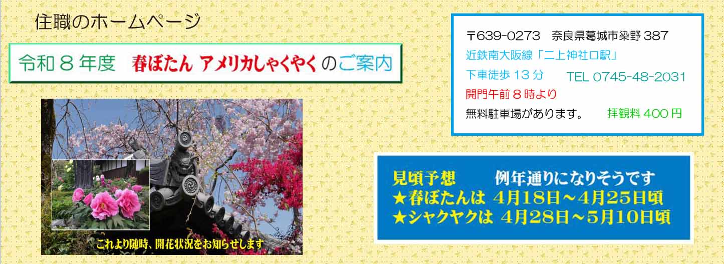 〒639-0273 奈良県葛城市染野387 近鉄南大阪線「二上神社口駅」下車徒歩13分 開門午前8時より 無料駐車場があります。 拝観料 400円 TEL 0745-48-2031