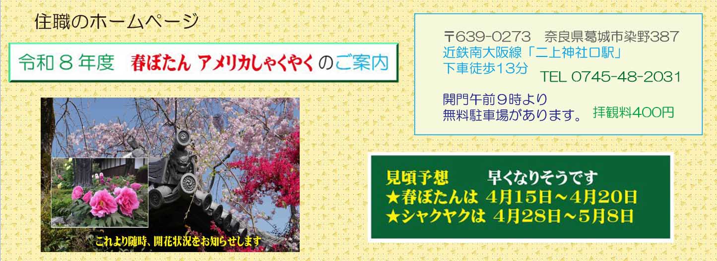 〒639-0273 奈良県葛城市染野387 近鉄南大阪線「二上神社口駅」下車徒歩13分 開門午前8時より 無料駐車場があります。 拝観料 400円 TEL 0745-48-2031